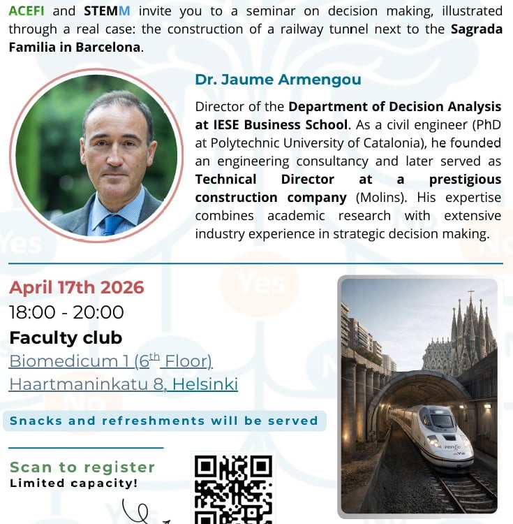 En un mundo lleno de incertidumbre, tomar la decisión correcta es más crucial que nunca. Este seminario, organizado por ACEFI y RAICEX, no solo explorará las claves para una mejor toma de decisiones estratégicas, sino que lo hará a través de un caso real y fascinante: la construcción de un túnel para trenes de alta velocidad junto a la Sagrada Familia en Barcelona. Acompáñanos a descubrir cómo se gestionó la controversia, los riesgos y los intereses de múltiples actores en uno de los proyectos de ingeniería más delicados de los últimos años.